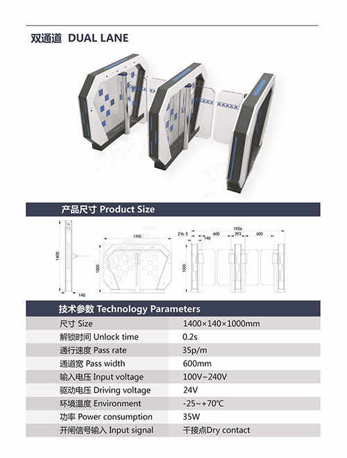 速通門346系統具備角度分辨和零位自檢功能,包含 500P/R 編碼器,分辨精度高,這種高精度的傳感器的優勢是使擺桿轉動_; 3.非法進入有報警提示功能; 4.防沖功能,在沒有接收功能開閘信號,擺臂自動鎖死; 5.紅外防夾功能,在擺臂復位的過程中紅外檢測到人在通道中,擺臂會自動回到打開狀態; 6. 統一標準的對外電氣接口,可與多種讀卡器相掛接,并可通過管理計算機實現遠程控制與管理; 7.
