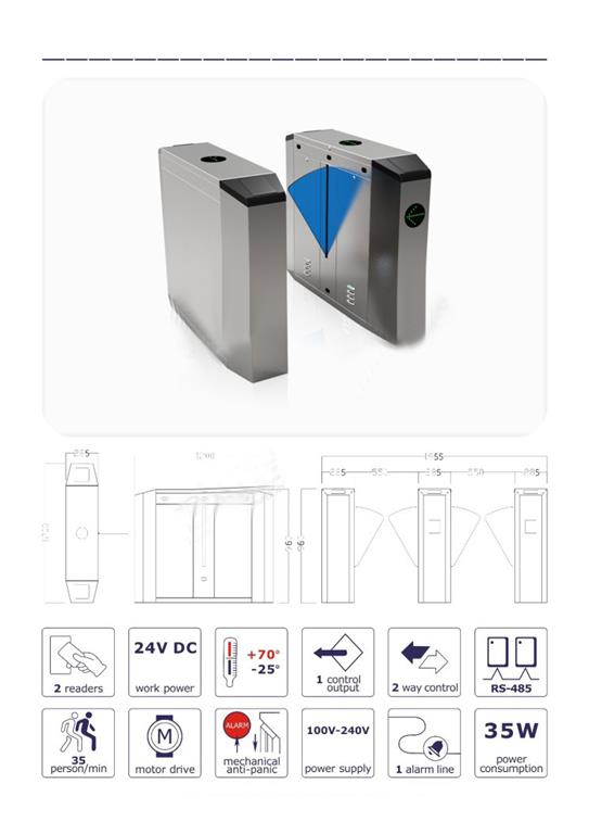 翼閘E242 1.尺寸:1200x280x960mm 2.解鎖時(shí)間: 0.2s 3.通行速度: 35 person/min 4.通道寬: ≤550mm 5.輸入電壓: 100V~240V 6.驅(qū)動(dòng)電壓: 24v 7.環(huán)境溫度: -25~+70℃ 8.功率: 30w 9.開閘信號(hào)輸入: 干接點(diǎn) 10.產(chǎn)品包裝: 珍珠棉加紙箱 11.產(chǎn)品型號(hào):