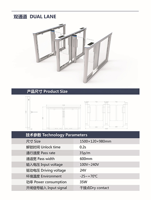 1.速通門B307系統(tǒng)具備防撞功能,當(dāng)有外物在未授權(quán)的狀態(tài)下撞擊擺桿,擺桿運(yùn)動角度達(dá)到菜單設(shè)定的值(如 2°),控制器_會啟動剎車機(jī)構(gòu),阻止擺桿運(yùn)動,并啟動聲光報警。當(dāng)外力進(jìn)一步增大,剎車控制器會保護(hù)擺桿不被撞斷,外力撤除后,擺桿自動歸位,系統(tǒng)正常; 2.速通門B307統(tǒng)具備角度分辨和零位自檢功能,包含 500P/R 編碼器,分辨精度高,這種高精度的傳感器的優(yōu)勢是使擺桿轉(zhuǎn)動_; 3.非法進(jìn)入有報警提示功能; 4.防沖功能,在沒有接收功能開閘信號,擺臂自動鎖死; 5.紅外防夾功能,在擺臂復(fù)位的過程中紅外檢測到人在通道中,擺臂會自動回到打開狀態(tài); 6.統(tǒng)一標(biāo)準(zhǔn)的對外電氣接口,可與多種讀卡器相掛接,并可通過管理計算機(jī)實(shí)現(xiàn)遠(yuǎn)程控制與管理; 7.速通門B307系統(tǒng)設(shè)有過流保護(hù)裝置,當(dāng)負(fù)載_過某設(shè)定值(如 2._),系統(tǒng)停止工作,以免燒壞電機(jī)等設(shè)備;