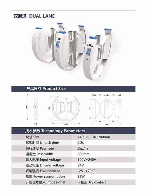 R3012 1.尺寸: 1400x170x1200mm 2.解鎖時(shí)間: 0.2s 3.通行速度: 35p/m 4.通道寬: 600mm 5.輸入電壓: 100v~240v 6.驅(qū)動(dòng)電壓: 24v 7.環(huán)境溫度: -25~+70℃ 8.功率: 35w 9.開閘信號(hào)輸入: 干接點(diǎn) 10.產(chǎn)品包裝: 紙箱+珍珠棉 11.產(chǎn)品型號(hào): R3012